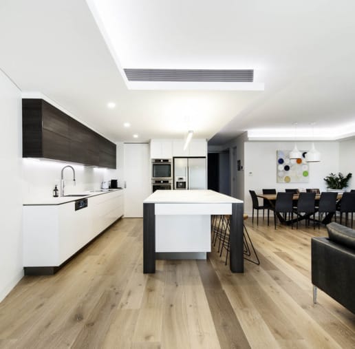 Mark was also able to install a dropped ceiling in the kitchen area, so high level aluminium grilles could be used as a functional design element for the air-conditioning. “Rather than just a number of unsightly holes in the ceiling for the ducted air conditioning system, the dropped ceiling with the grilles provides interest making it beautiful and slick, and making the ceiling appear higher” says Mark.
