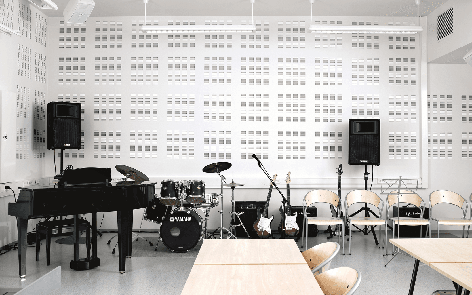 Absorbs sound into the ceiling and walls to prevent reverberation