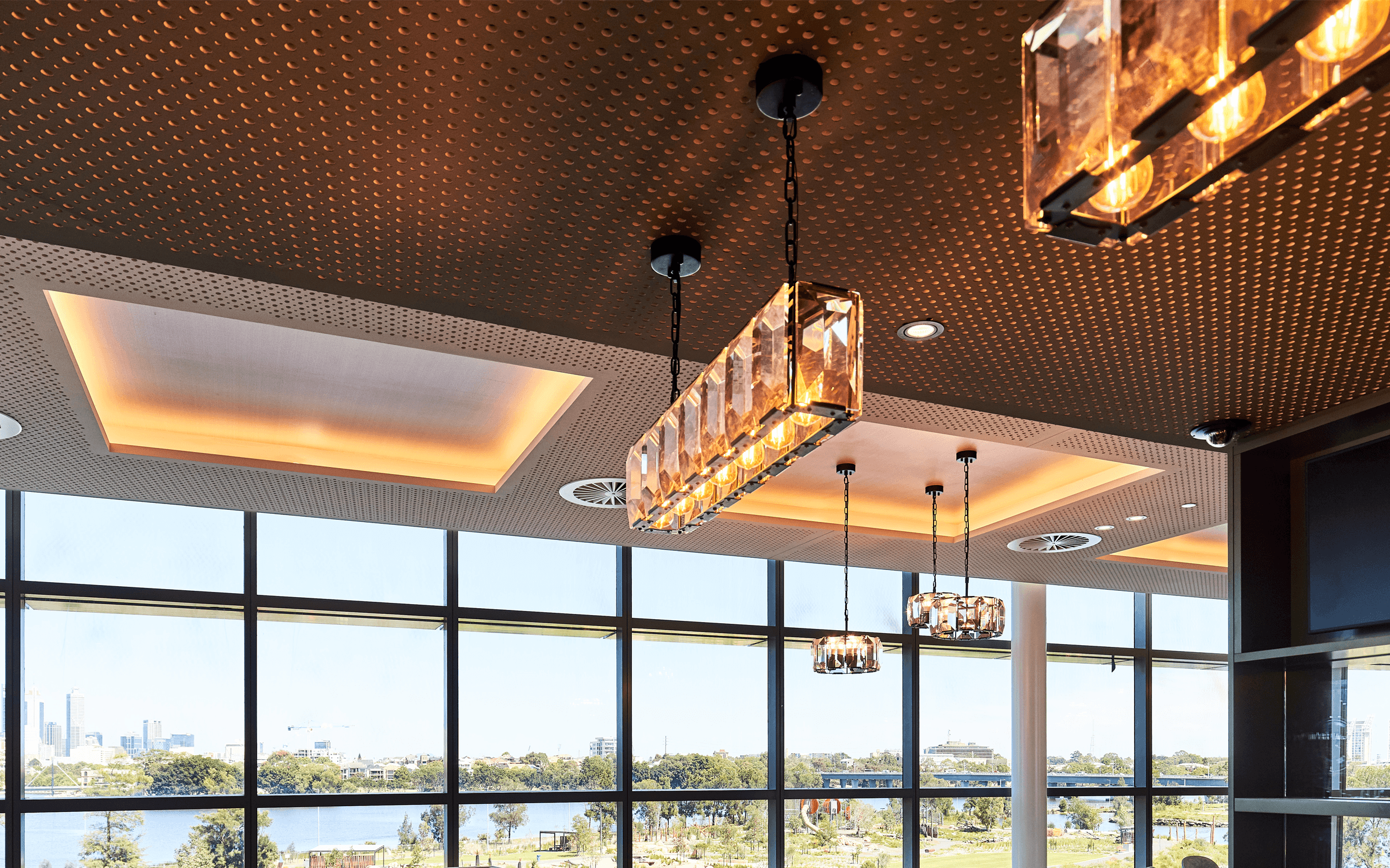 Rigitone perforated plasterboard is typically used as a high performance plasterboard for ceilings in commercial constructions where a high level of acoustic performance is required. This includes applications such as theatres, restaurants, shopping centres and hotel foyers. Whilst perforated plasterboard in predominantly installed in ceilings, it is suitable for use in walls.