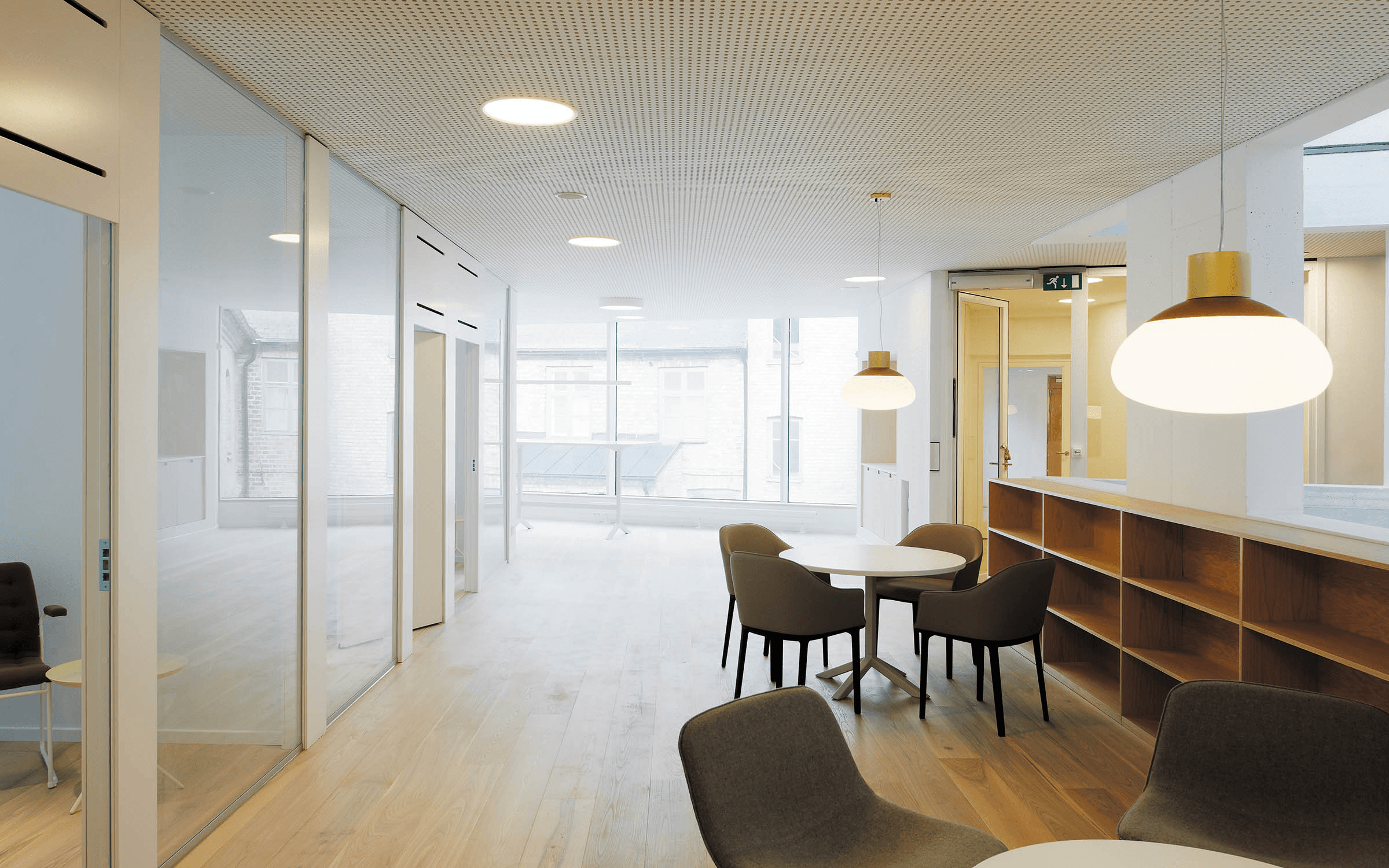 Manufactured by worldwide plasterboard specialist, Saint-Gobain, Rigitone is purpose built to provide exceptional acoustic control with ultimate design freedom. High levels of acoustic absorption are achieved through a combination of perforation patterns and a highly effective black acoustic fabric backing which also prevents dust from the ceiling entering the room and masks the ceiling framework.
